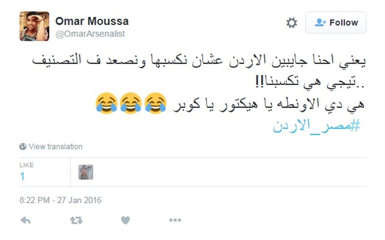 وتندر المغردون أيضًا على الهزيمة في مباراة لعبها المنتخب من أجل الفوز لتحسين وضعه في تصنيف الفيفا، وقال عمر موسى: "يعني إحنا جايبين الأردن عشان نكسبها ونصعد في التصنيف تيجي هي تكسبنا!! هي دي الأونطة يا هيكتور يا كوبر".
