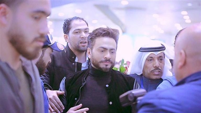 المطرب المصري تامر حسني قام بتقبيل الأطفال والتقاط الصور معهم، كما التقط أيضًا صورة سيلفى مع الجمهور بمطار الكويت