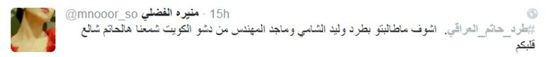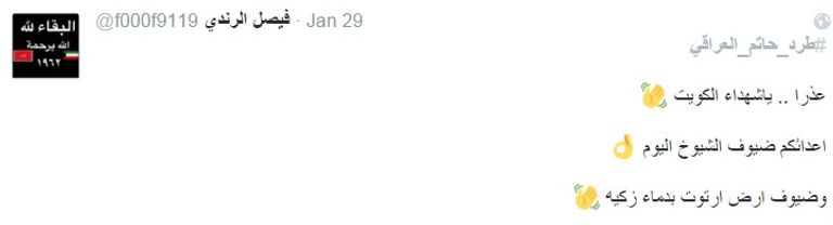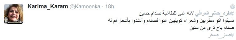 ووسط مئات التغريدات المطالبة بطرد الفنان العراقي ظهرت تدوينات تنتقض الحملة الموجهة ضده، مدللين على ذلك بأن عدد من مطربين الكويت شدوا لصدام حسين دون أي داع، معتبرين أن حاتم العراقي قد يكون مضطر لأن يغني ذلك.