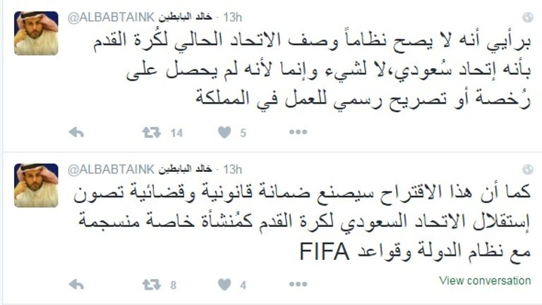 وكتب في تغريدته الأولى "برأيي أنه لا يصح نظامًا وصف الاتحاد الحالي لكُرة القدم بأنه سُعودي، لا لشيء إلا لأنه لم يحصل على رُخصة أو تصريح رسمي للعمل في المملكة".