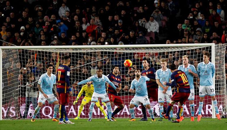 ورغم سيطرته على الشوط الأول وتقدمه في الدقيقة 28 من ركلة حرة رائعة لنجمه الأرجنتيني ليونيل ميسي، الذي لعب منذ البداية بعد أن كان الشك يحوم حول مشاركته بعد خضوعه لعملية تفتيت حصيات الكلى، أنهى النادي الكاتالوني النصف الأول من اللقاء متعادلا بعدما نجح سيلتا فيجو في تسجيل هدف من ركلة جزاء في الدقيقة 39 عبر السويدي يون جويديتي، الذي أصبح أول لاعب يسجل في شباك البطل من ركلة جزاء هذا الموسم.