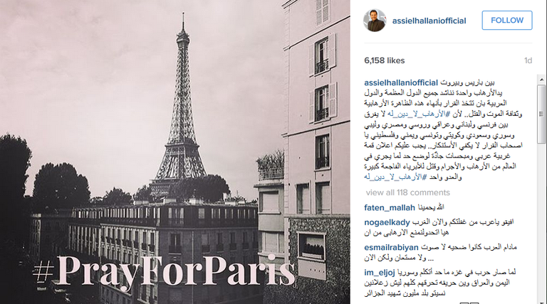 ووضع النجم اللبناني عاصي الحلاني صورة للبرج، قائلا: "بين باريس وبيروت يد الإرهاب واحدة"، في إشارة إلى التفجيرات الإرهابية التي وقعت في بيروت قبل تفجيرات باريس بيوم واحد.