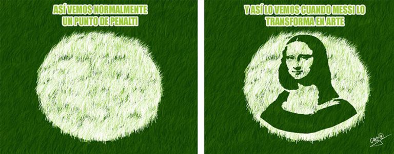 ووضعت الصحيفة رسمًا ساخرًا، يظهر على اليسار علامة وضع الكرة على منطقة الجزاء بشكل طبيعي، بينما في اليمين يبدو مرسومًا على تلك العلامة لوحة الموناليزا الشهيرة، في دلالة على تحويل النجم الأرجنتيني لهذه التسديدة التي عادة ما يكون تنفيذها نمطيًّا إلى لوحة فنية.