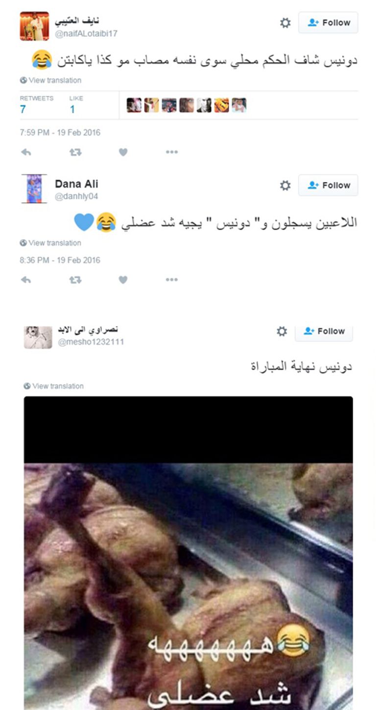 كما تهكَّم بعض المشجعين المنافسين على دونيس، ونشر مغرد لقب نفسه بـ"نصراوي إلى الأبد" صورة كوميدية وعلق عليها قائلًا: "دونيس نهاية المباراة".