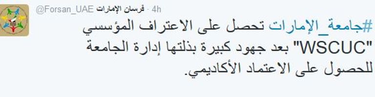 ونشر الحساب الرسمي "فرسان الإمارات" على "تويتر"، خبر حصول الجامعة على الاعتماد المؤسسي "WSCUC".