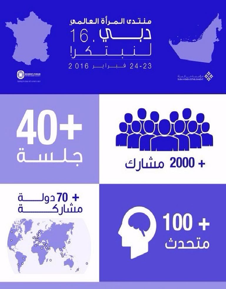 تنطلق غداً تحت شعار "لنبتكر" فعاليات منتدى المرأة العالمي2016، المنظم من طرف "مؤسسة دبي للمرأة" بالتعاون مع "منتدى المرأة للاقتصاد والمجتمع"، والذي يستمر يومين في فندق جميرا دبي، برعاية الشيخ محمد بن راشد آل مكتوم، نائب رئيس دولة الإمارات، رئيس مجلس الوزراء حاكم دبي.