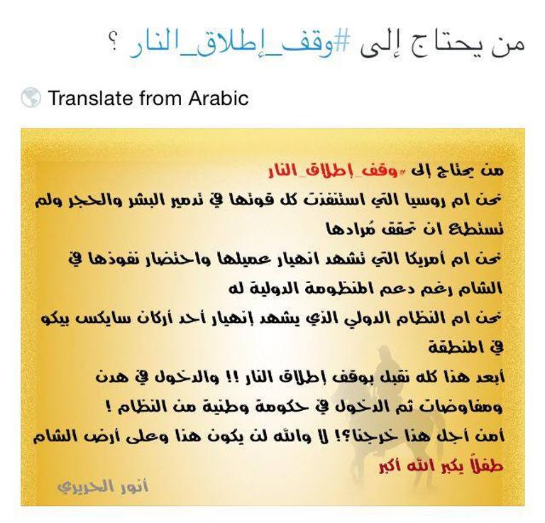 أما أنور الحريري فيتسائل عن من يحتاج إلى وقف إطلاق النار؟ وكتب قائلًا "نحن أم روسيا التي استنفذت كل قوتها في تدمير البشر والحجر ولم تستطع أن تحقق مرادها.. نحن أم أمريكا التي تشهد احتضار نفوذها في الشام رغم دعم المنظومة الدولية له.. نحن أم النظام الدولي الذي يشهد انهيار أحد أركان سايكس بيكو في المنطقة.. أبعد هذا كله نقبل بوقف إطلاق النار !! والدخول بهدن ومفاوضات.. لا والله لن يكون هذا وعلى أرض الشام".