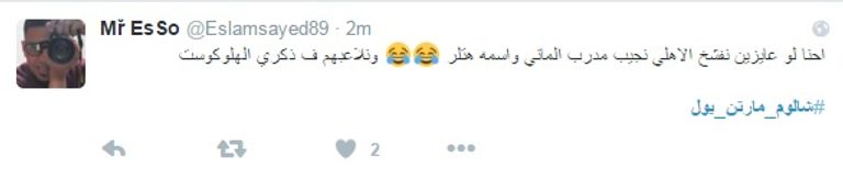 الهاشتاق الذي حمل اسم # شالوم_مارتن_يول يجزم بأن المدرب الجديد يهودي الديانة، لذلك حاول بعض مشجعي الأهلي المشاركين بتغريدات في الهاشتاق توضيح أن هناك فارق بين اليهودية كديانة والإسرائيلية كجنسية.