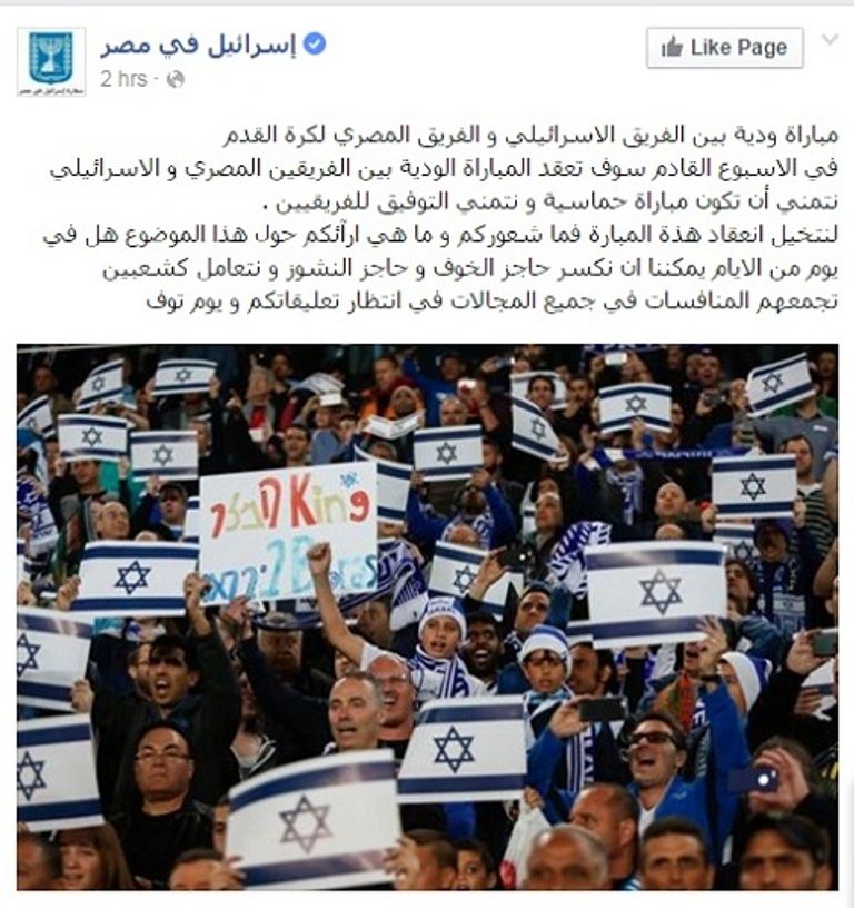 وعرضت السفارة الإسرائيلية بالقاهرة منشورا على صفحتها الرسمية على فيسبوك عن مباراة "تخيلية" تجمع بين مصر وإسرائيل.