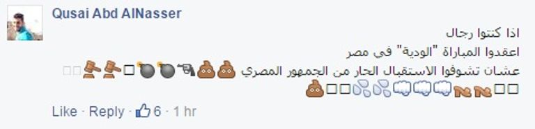 وقال قصي عبد الناصر من الضفة الغربية "إذا كنتم رجالاً، فاعقدوا المباراة الودية في مصر، عشان تشوفوا الاستقبال الحار من الجمهور المصري". وأضاف محمود معروف من مصر "ونلاعبكو ع أساس انك اي ،، ولا دوله ولا حتى نادى الطالبيه ،، بلد ليس لها وجود من الأساس".