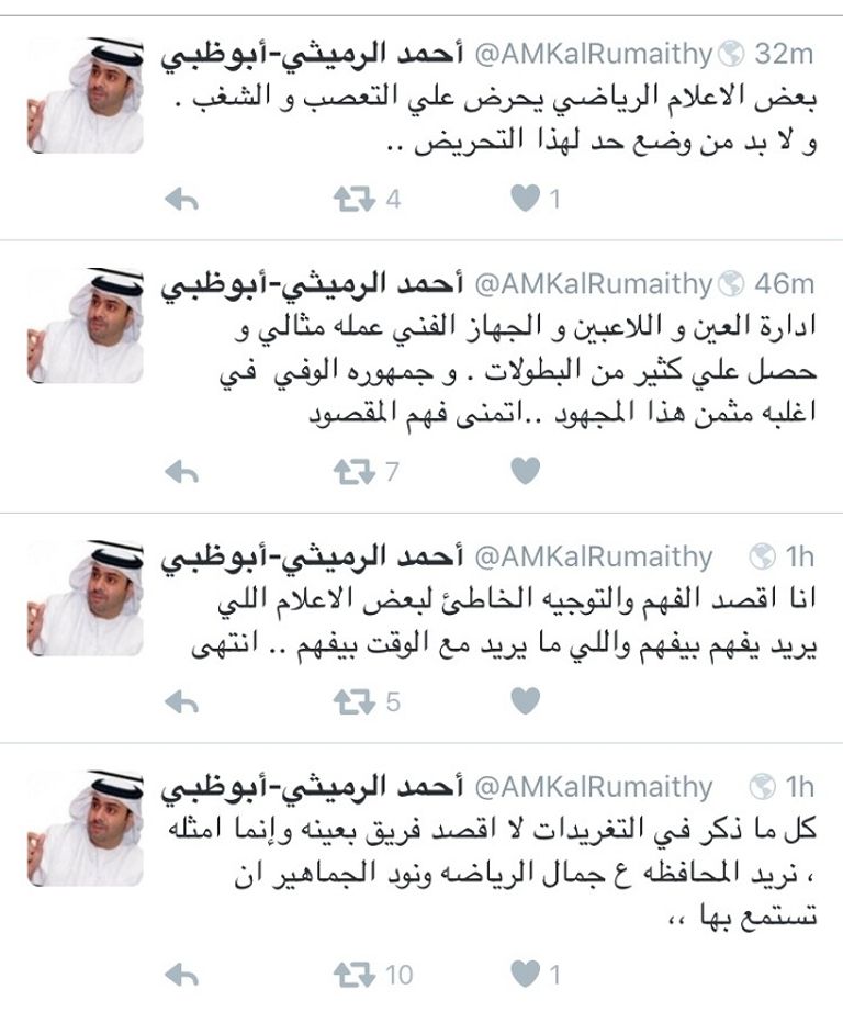 وأكد الرميثي في تغريدات له عبر موقع التواصل الاجتماعي تويتر أن ما حدث لا يليق من جماهير فريق يحصد البطولات ويزخر بالنجوم ولديه إدارة قوية تعمل من أجل المستقبل.