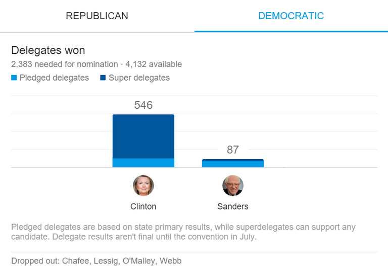 أما بالنسبة للديموقراطيين، فقد اكتسحت هيلاري كلينتون "الثلاثاء الكبير"، بـ 546 نقطة، فيما حصل منافسها بيرني سانديرز على 87 نقطة فقط.