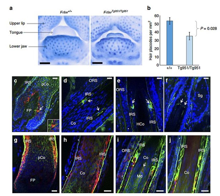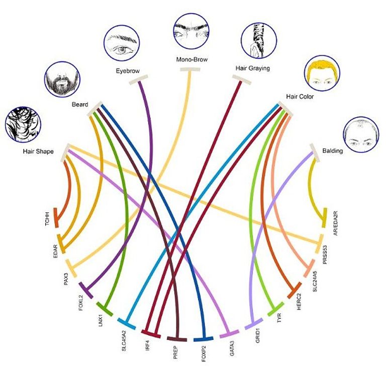 واكتشف الباحثون جينًا منفصلًا، اسمه "جي آر آي دي 1" يرتبط بالصلع، في حين يساعد جين آخر يسمى "فوكس 12" على تحديد سمك الحاجبين لدى الأشخاص، بينما تسبب نسخة معينة من جين "باكس3"، احتمال ظهور التقاء الحاجبين، وأخيرًا فإن الجين المسؤول عن تجعد الشعر، أو نعومته هو جين "تي سي إتش إتش".