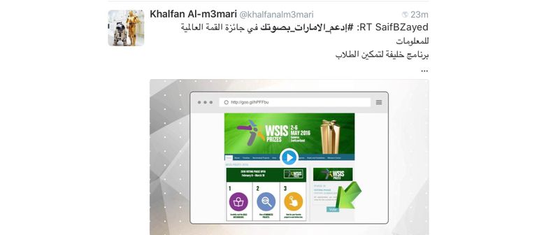مغردون على "تويتر" يقودون حملة لحثّ الإماراتيين، للتصويت لصالح بلادهم للفوز بجوائز القمة العالمية لمجتمع المعلومات.