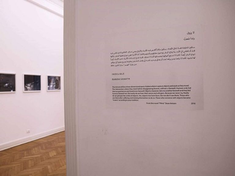 تفاجئ شعث زائر المعرض في الواجهة بمقطع من أحدث روايات الكاتب العراقي سنان أنطون "فهرس" (دار الجمل، 2016) كتعريف ومدخل لمعرضها "ستكون الدقيقة فضاءً ثلاثي الأبعاد، ستكون مكاناً اقتنص فيه الأشياء والأرواح وهي تسافر، التقاطع الذي تلتقي فيه قبل أن تختفي إلى الأبد. بلا وداع، البشر يودعون معارفهم وأحبتهم فقط. أما الأشياء فهي تودع بعضها البعض، لكنها تودع البشر أيضاً، لكننا لا نستطيع أن نسمع أصواتها وهمساتها لأننا لا نحاول، قلما نلمح ابتسامات الأشياء. نعم الأشياء أيضاً لها وجوه، لكننا لا نراها".