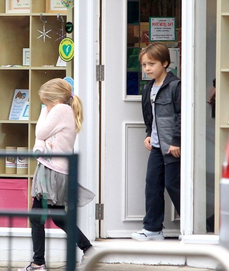 بينما شوهد التوأم نوكس وفيفيان، "7 أعوام"، وهما يخرجان من المتجر بعد الاستمتاع بقضاء وقت مرح في طلاء الأطباق.