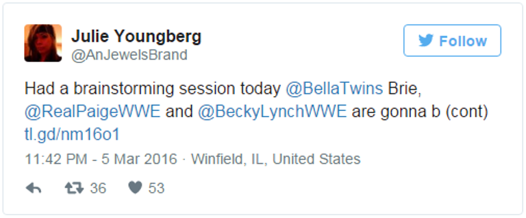 وقالت في التغريدة: "قمت بعمل جلسة عصف ذهن اليوم .. ستقوم بري بيلا وبيج وبيكي لينش بالمنافسة"، وكتبت أيضًا: "أنا سعيدة بما أقوم به"، وشكرت المصارعات؛ لأن المنافسة شيء ممتع لها.