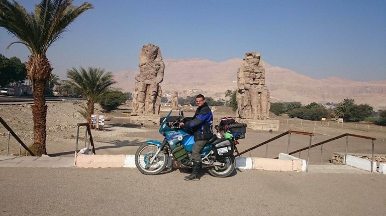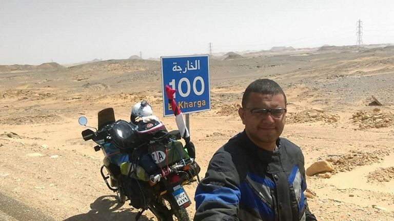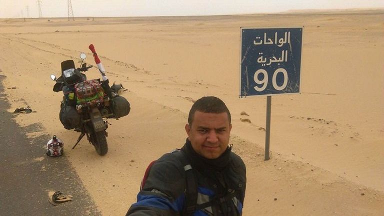 علي عبده يرفع شعار "مصر أمان .. مصر بخير"، وسافر قرابة 30 ألف كيلومتر داخل محافظات ومدن مصر مستخدمًا دراجة بخارية لدعم السياحة.