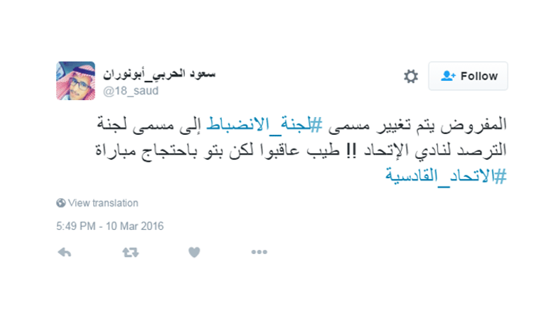 أما سعود الحربي أبونوران فقال "المفروض يتم تغيير مسمى لجنة الانضباط إلى مسمى لجنة الترصد لنادي الاتحاد!! طيب عاقبوا لكن بتو باحتجاج مباراة الاتحاد والقادسية".