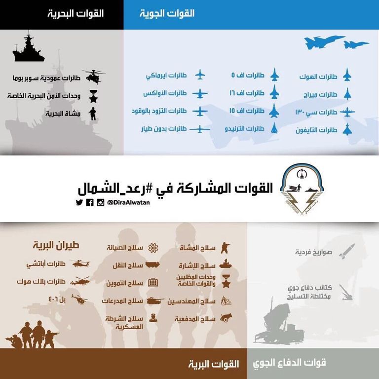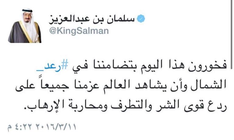 وكتب الملك سلمان على حسابه الرسمي بموقع التواصل الاجتماعي "تويتر": "فخورون هذا اليوم بتضامننا في رعد الشمال، وأن يشاهد العالم عزمنا جميعًا على ردع قوى الشر والتطرف ومحاربة الإرهاب".
