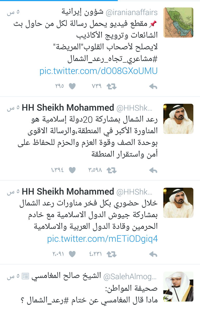 الشيخ محمد بن راشد، نائب رئيس الإمارات رئيس مجلس الوزراء حاكم إمارة دبي وزير الدفاع، علق على هذا الحدث من خلال حسابه على "تويتر" قائلًا: "خلال حضوري بكل فخر مناورات رعد الشمال بمشاركة جيوش الدول الإسلامية مع خادم الحرمين وقادة الدول العربية والإسلامية، رعد الشمال بمشاركة 20 دولة إسلامية في المناورة الأكبر بالمنطقة، لنؤكد الرسالة الأقوى بوحدة الصف وقوة العزم والحزم للحفاظ على أمن واستقرار المنطقة، وطائرات مقاتلة من مختلف الطرازات".