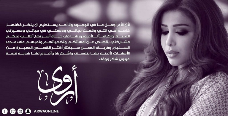طلبت الفنانة اليمنية أروى من جمهورها مشاركة قصص تضحيات وتعب أمهاتهم، على أن تحظى الأكثر تأثيرًا منها على هدايا وشكر خاص من المغنية نفسها، وذلك تزامنًا مع احتفالات "عيد الأم".