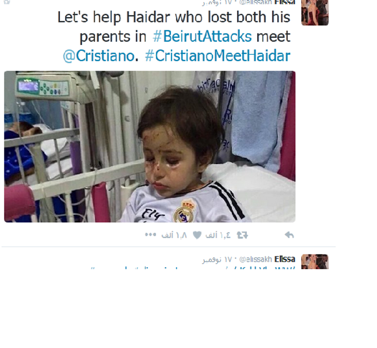 إليسا غرَّدت قائلة: "لنساعد حيدر الذي فقد والديه في انفجار بيروت على لقاء رونالدو". وانضمت إليها نانسي عجرم التي أعادت تغريدة إليسا.
