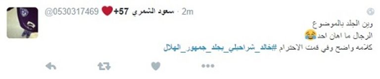 وتحت هاشتاق " #خالد_شراحيلي_يجلد_جمهور_الهلال" الذي جاء ضمن قائمة أنشط الهاشتاقات في المملكة اليوم، اشتبك نشطاء من مشجعي الفريقين في نقاشات جانبية، حيث حاول مشجعو النصر البناء على انتقاد شراحيلي لكيل الاتهامات لجمهور الهلال وفريقهم، بينما رد مشجعو الأزرق بتذكير جماهير العالمي بتصريح سابق لرئيس النادي الأمير فيصل بن تركي عاتب فيه جماهير ناديه بقسوة وطالبهم بأن يحضروا المباريات وهم صامتين.