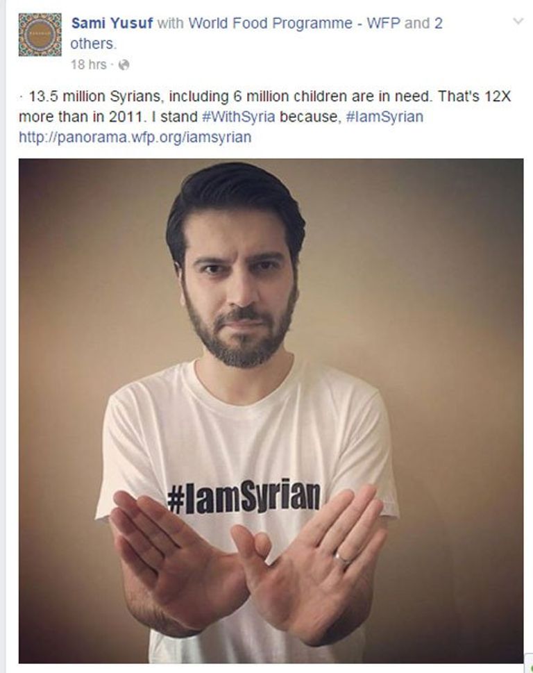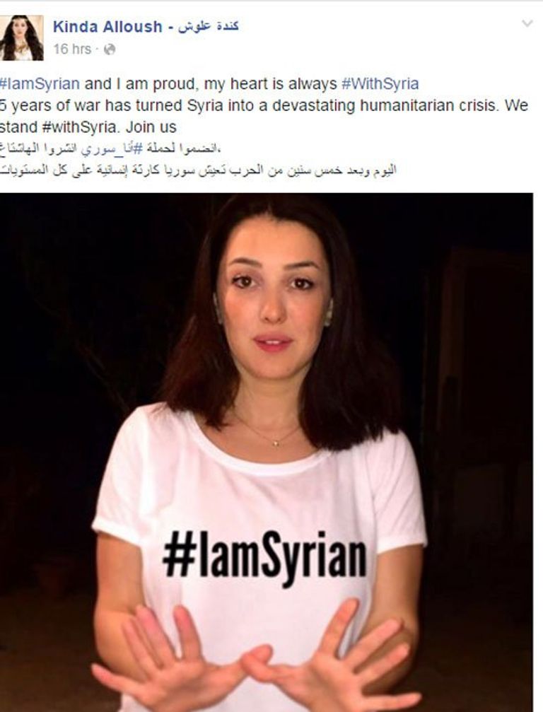 وتحت هاشتاج #IAmSyrian كتبت الفنانة السورية كندة علوش على صفحتها العامة: "انضموا لحملة أنا سوري وانشروا الهاشتاج، اليوم وبعد 5 سنين من الحرب تعيش سوريا كارثة إنسانية على كل المستويات".