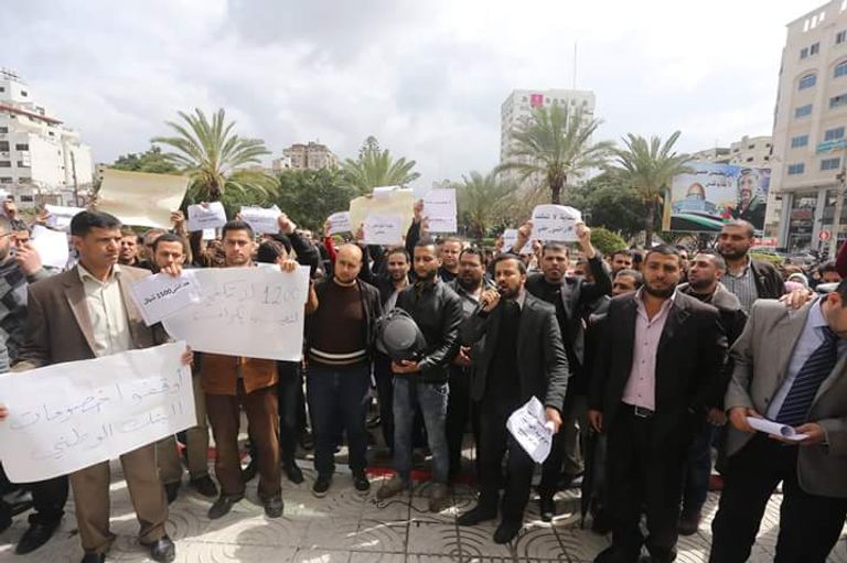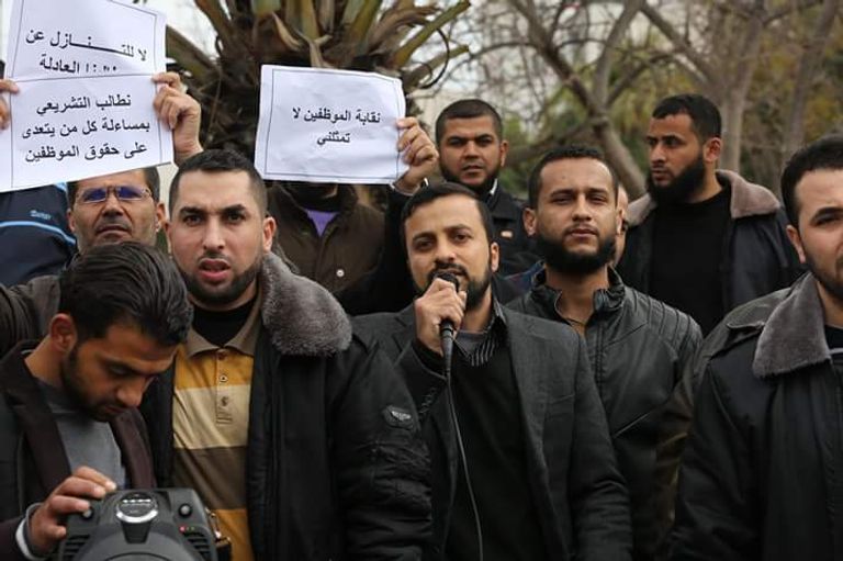 تظاهر العشرات من موظفي وزارات غزة التي تديرها حركة حماس، للمطالبة بصرف رواتب كاملة لهم، في أول احتجاج علني ينظمه الموظفون في غزة.