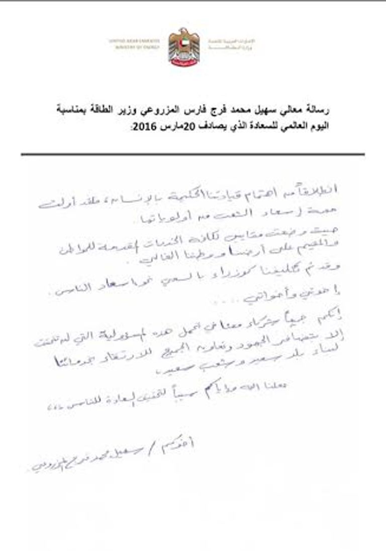 بعث وزير الطاقة الإماراتي، سهيل محمد فرج فارس المزروعي، برسالة بمناسبة اليوم العالمي للسعادة الذي يصادف، اليوم الأحد، 20 مارس/آذار 2016.