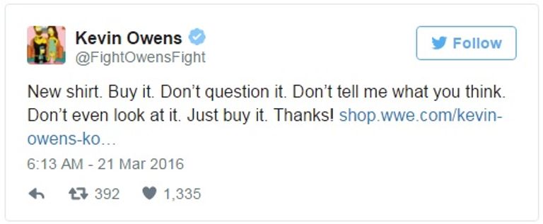 المصارع كيفين أوينز أطلق تغريدة على حسابه على "تويتر" للترويج لقميصه الجديد بكلمات توحي لكل من يقرأها بأنه مجبر على الشراء.