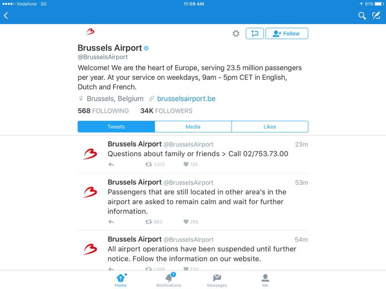 وحذرت الحكومة البلجيكية من التوجه إلى المطار أو التواجد في المنطقة القريبة له، وذلك عبر الحساب الرسمي لمطار بروكسل، الذى أكد في تغريدة أخرى إلغاء كافة الرحلات، ووجود جميع الركاب في منطقة آمنة، وحدد رقم هاتف للتواصل مع أهالي الركاب.