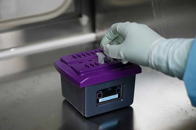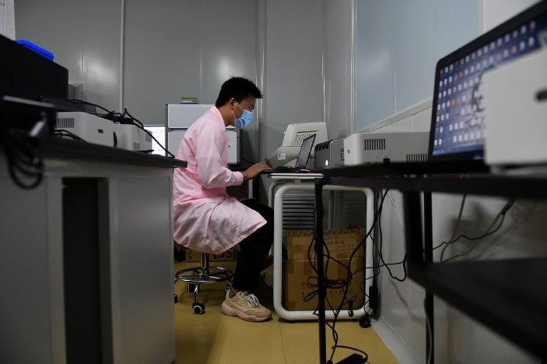 وفي أحد مختبرات بكين، تأخذ عاملة ترتدي معطفا زهري اللون عينة مأخوذة من الجهاز التنفسي لأحد الأشخاص تضيف إليها الكواشف وتضعها في جهاز أبيض وأسود بحجم طابعة.