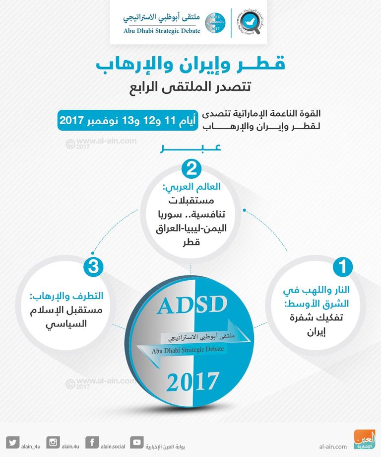 9 جلسات تناقش 10 محاور تتصدرها قطر وإيران والإرهاب في إطار النسخة الرابعة لملتقى أبوظبي الاستراتيجي، الذي ينظمه مركز الإمارات للسياسات.