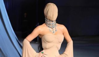 أثارت كيم كارداشيان اهتمام الحضور بإطلالة غامضة، إذ ارتدت قناعًا كاملًا من تصميم دار «مارجيلا كوتور» غطّى وجهها بالكامل وحدّ من قدرتها على الرؤية.