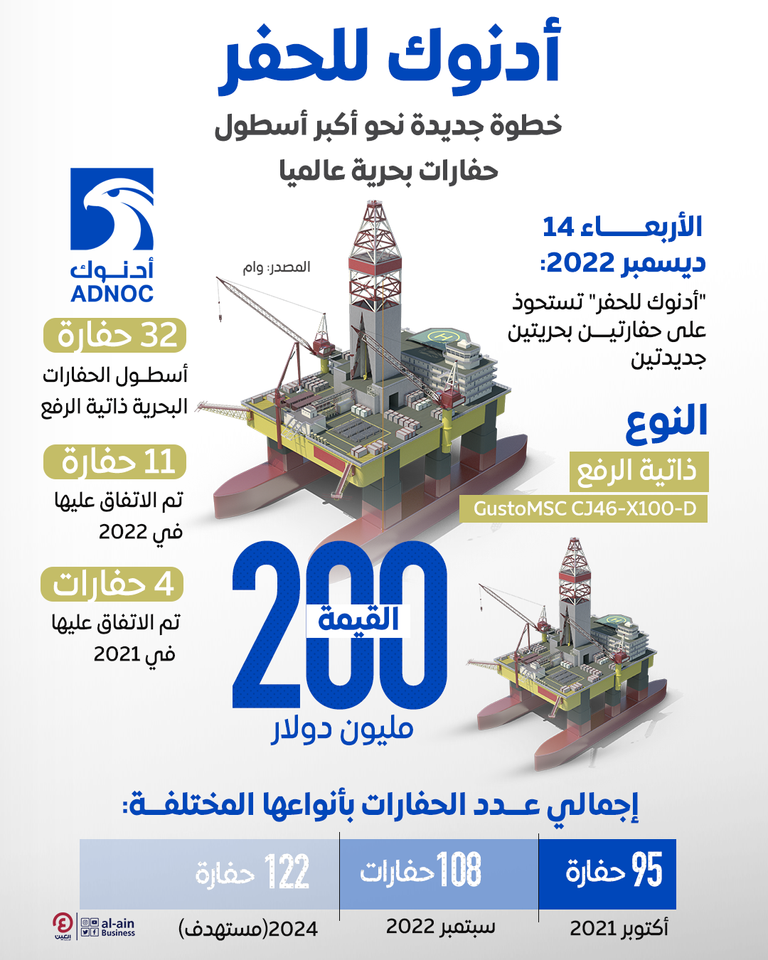 وأعلنت شركة "أدنوك للحفر" اليوم توقيعها اتفاقية للاستحواذ على حفارتين بحريتين جديدتين مُتطورتين ذاتيتي الرفع من نوع (GustoMSC CJ46-X100-D) بقيمة 734.7 مليون درهم (200 مليون دولار أمريكي).