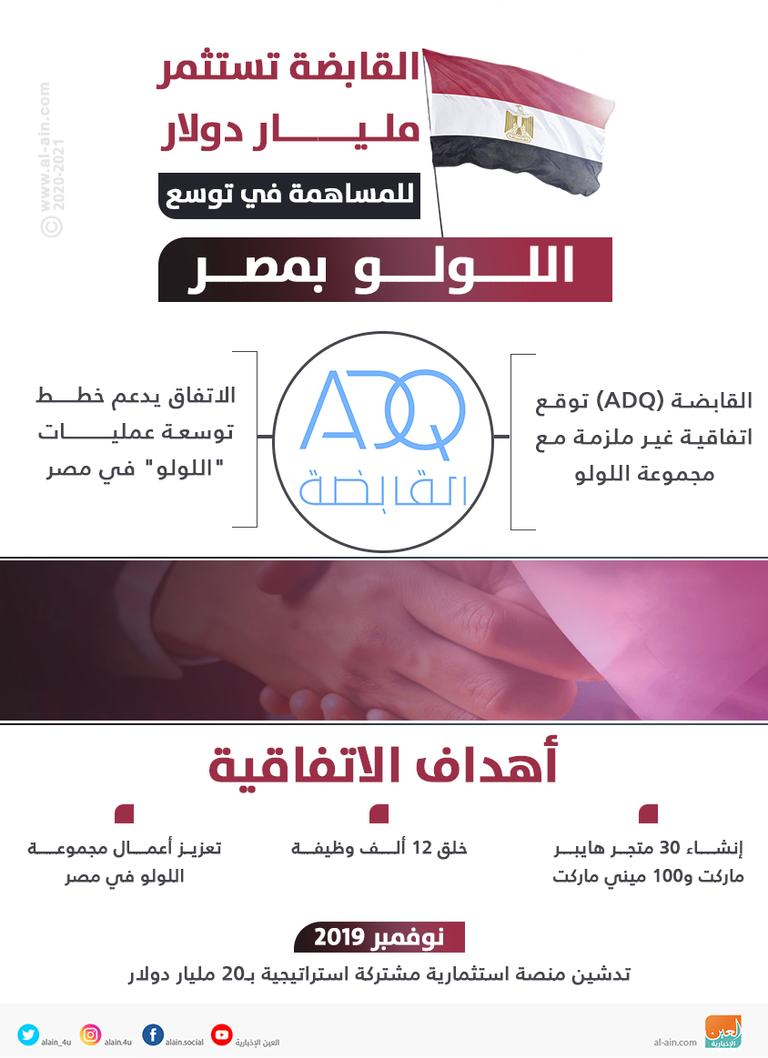 وقال محمد حسن السويدي، الرئيس التنفيذي لـ"القابضة" (ADQ): "تأتي اتفاقيتنا مع مجموعة اللولو العالمية في إطار التزامنا العام تجاه الاستثمار في مصر، وذلك بعد الإعلان عن تأسيس المنصة الاستثمارية المشتركة مع صندوق مصر السيادي في أواخر العام الماضي.
