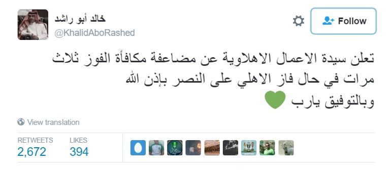 أعلن المحامي والمستشار القانوني خالد ابو راشد المعروف بانتمائه لنادي أهلي جدة، عبر حسابه الشخصي بموقع التواصل الاجتماعي "تويتر"، أن "سيدة الأعمال الأهلاوية" قررت رصد 3 أضعاف المكافأة العادية التي يحصل عليها لاعبو الملكي حال فوزهم على فريق النصر الجمعة في الجولة السادسة من الدوري السعودي للمحترفين..