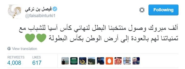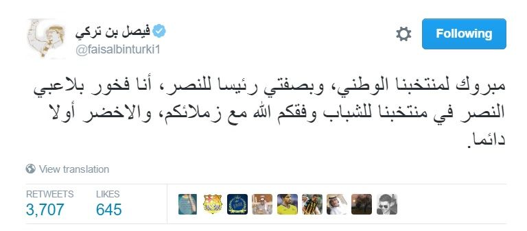 من جهته هنأ فيصل بن تركي رئيس نادي النصر، نجوم منتخب الشباب السعودي على التأهل لنهائي البطولة المقامة خالياً في البحرين.