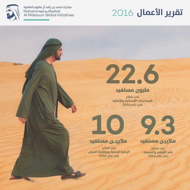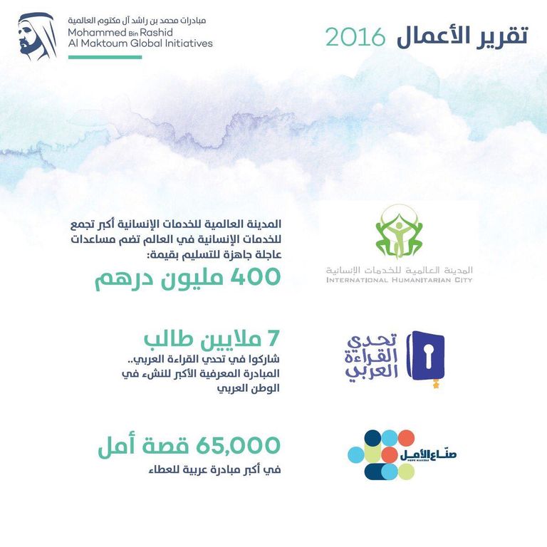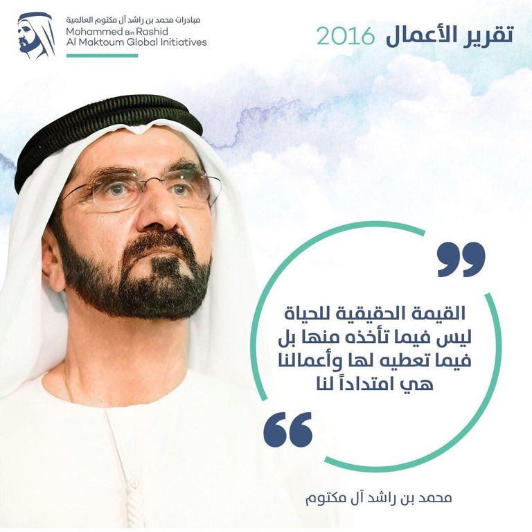 أعلن الشيخ محمد بن راشد آل مكتوم نائب رئيس دولة الإمارات رئيس مجلس الوزراء حاكم دبي النتائج السنوية لأعمال مؤسسة "مبادرات محمد بن راشد آل مكتوم العالمية" للعام 2016.
