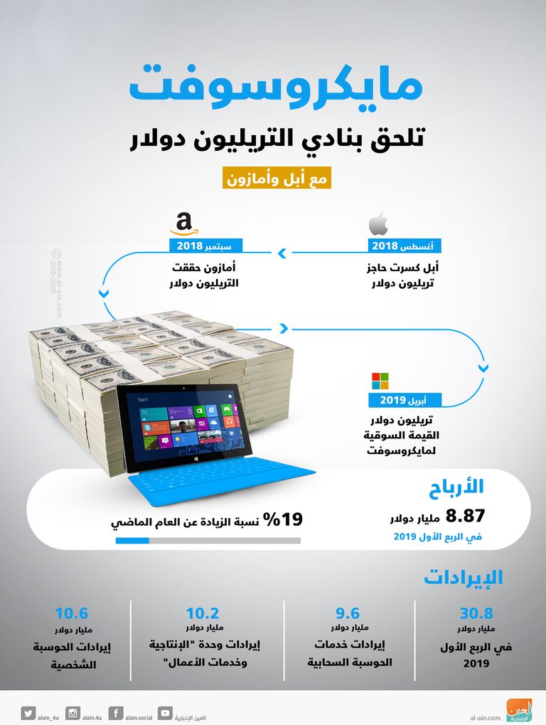وأشارت الشركة الأمريكية، بحسب ما نشرته "فرانس برس"، الخميس، إلى أن أرباحها في الربع الأول من العام الجاري، ارتفعت بصورة كبيرة، بسبب خدماتها السحابية والخدمات التجارية التي أطلقتها "مايكروسوفت"، ما تسبب في إغلاقها، عند مستوى القيمة السوقية تريليون دولار.