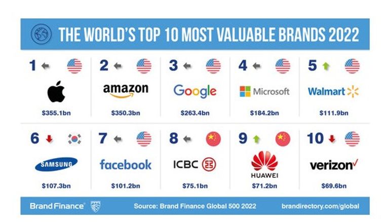 وتمكنت أبل من تصدر قائمة العلامات التجارية الأكثر قيمة عالميا وفقا لتقرير براند فاينينس 2022 بعد زيادة قيمة علامتها التجارية بنحو 35٪ لتصل إلى 355.1 مليار دولار أمريكي - وهي أعلى قيمة للعلامة التجارية تم تسجيلها على الإطلاق في تصنيف براند فينينس.