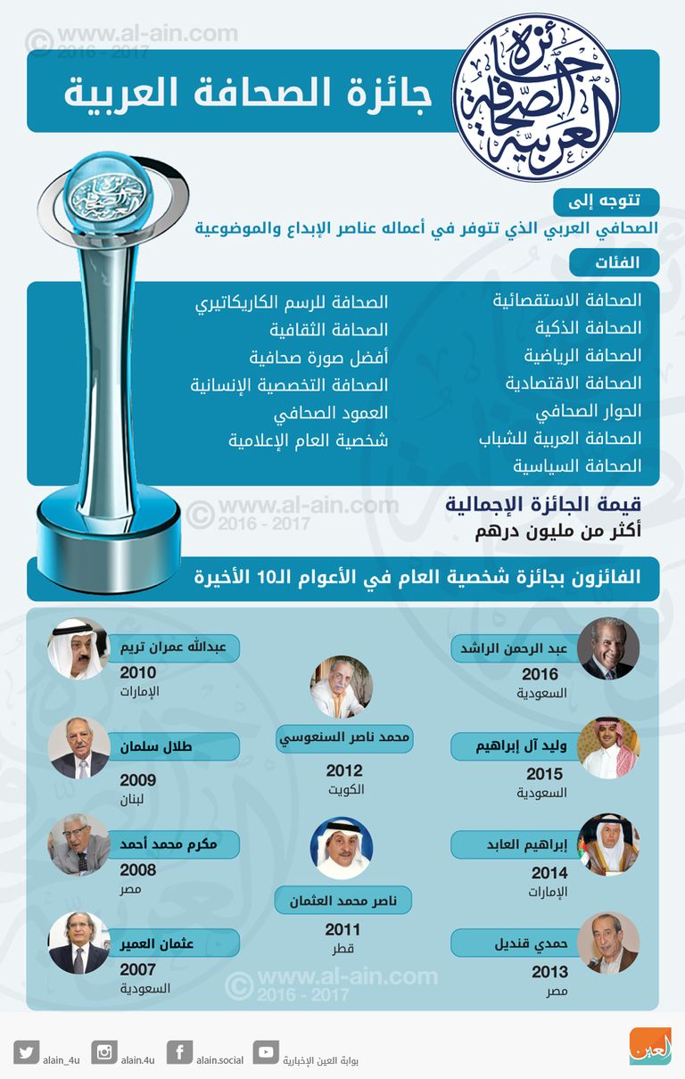 جائزة الصحافة العربية تشهد نمواً مستمراً ويشارك فيها صحافيون من 32 دولة.. "العين" ترصد لكم في هذا الإنفوجراف أهم فئاتها وشخصياتها المكرمة