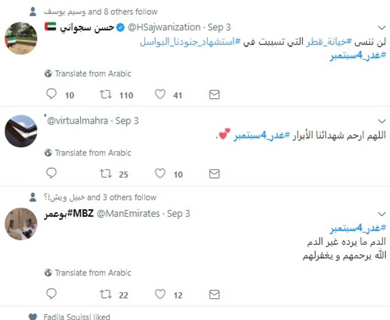 أما المواطن الإماراتي إبراهيم بهزاد، فقال في تغريدة له: "غدر قطر في 4 سبتمبر، حينما تبلغ الخيانة مداها وتصبح قطر خنجرا في خاصرة الأشقاء".