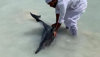 وتظهر صور دلافين تحاول العودة إلى أعماق البحر الأحمر، ثم يعيدها رجال بأيديهم إلى المياه الفيروزية الصافية المحاطة بالرمل الأبيض.