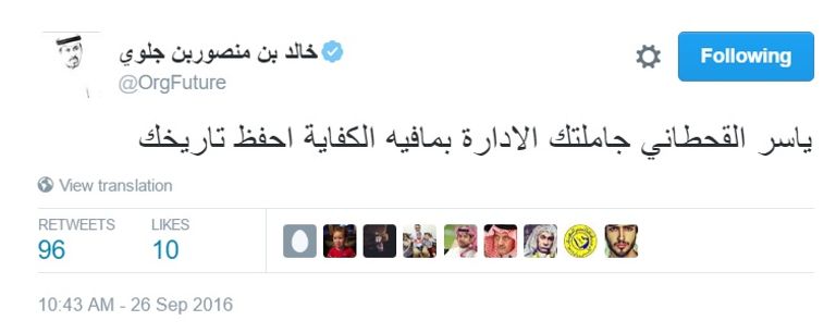 وكتب بن جلوي على حسابه الشخصي بموقع التواصل الاجتماعي "تويتر": "ياسر القحطاني جاملتك الادارة بمافيه الكفاية احفظ تاريخك".