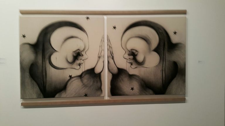 100 يد سوداء، للتشكيلية السعودية "مها ملوح" هي عبارة عن مجسمات لأيد نسائية تلبس قفازات سوداء طويلة، تفوح منها رائحة (ثقيلة) وتم حشوها بمادتي الرمل والأسفنج، ثم رصّها على أرضية أحد الأركان، الأيادي بقفازاتها ومن كثرتها ولمنظر الأصابع المشرئب، قد تبدو كغربان أو كغابة من أشجار سوداء كالحة شديدة السوداء، ثم تلك البراويز القماشية المزخرفة من اشكال السجاد التي تزين طرف كل قفاز تدفعك للتأمل كثيرا، رغم اختلاف "الترجمات" لهذا العمل، إلا أنه يمكننا القول: إن الفنان لا يؤدي العمل المبتكر وحده وإنما يشاركه المشاهد وهو يحاول فك رموز وتفسير ذلك العمل.