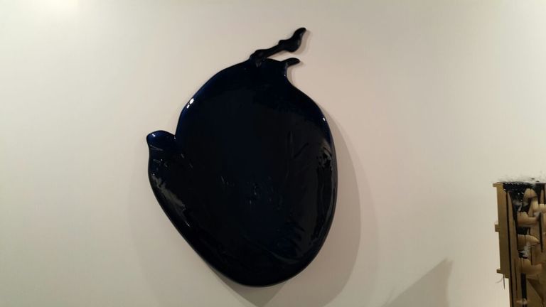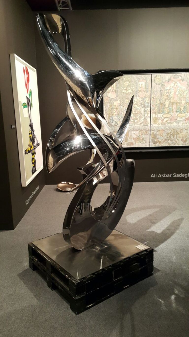 "الفيولا" آلة وترية من عائلة الكمان، يتجاوز الفان الإيراني مسعود إخوان جم، في تصميمها في عمل فني تركيبي، من الستيل، حدود الآلة الموسيقية، ليجعل منها، وبلمسته السحرية، عملا تركيبيا على هيئة إنسان، تستطيع أن تلمس وجعه وآلامه، ليضع المتلقي أمام مسافة واحدة من الأمل والألم، ولتبرز هشاشة هذا الكائن وقوته، أما هذا الستيل المصقول اللامع بفعل غضاءة المكان، فيسحر مدركك البصري، ويجعل تدخل حيز العمل الفني طواعية.