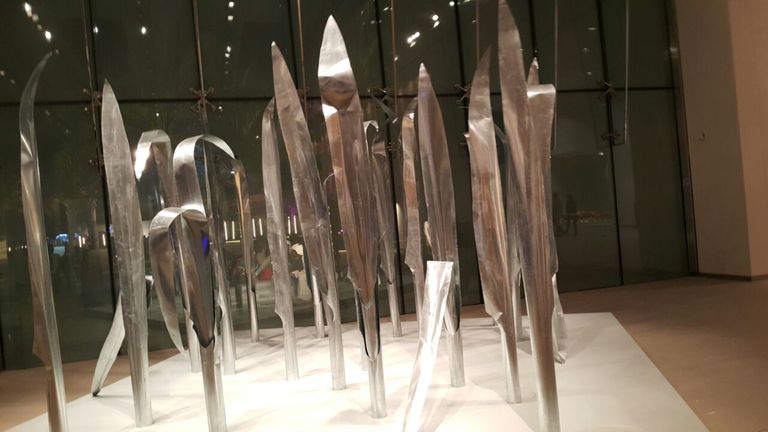 8 زوايا حادّة غير متساوية، عمل تركيبي نادر من ألواح صيغت بترتيب هرمي من الحديد الصلب كورتن، للفرنسي "برنار فينيه" حتى بدا التشكيل البالغ ارتفاعه نحو 4 أمتار، في مجمله نسخة ثلاثية الأبعاد، تمثل بصقلها باللون البني الغامق، جولة مكثفة في تاريخ المعاصرة، في هذه الزوايا الحادة ثمة تقنية بارعة، وشغف شديد من جانب "فينيه" بالمواد المعدنية، حيث كرّس من خلالها قيما إنسانية عديدة مثل الشموخ الإنساني.
